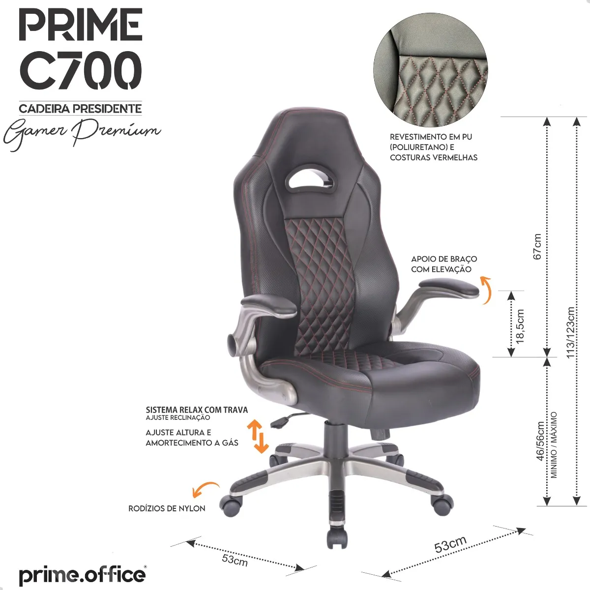| MEDIDAS DO PRODUTO (L×A×P) Altura do encosto 72 cm Profundidade do assento 53 cm Largura da cadeira 53 cm Altura máxima da cadeira 128 cm |