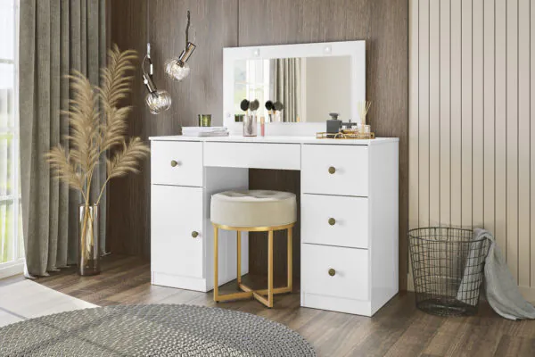 Penteadeira camarim luxo com led branco acetinado. Tampo superior com vidro para visão ao porta joias, gavetas com corrediças telescópicas.
