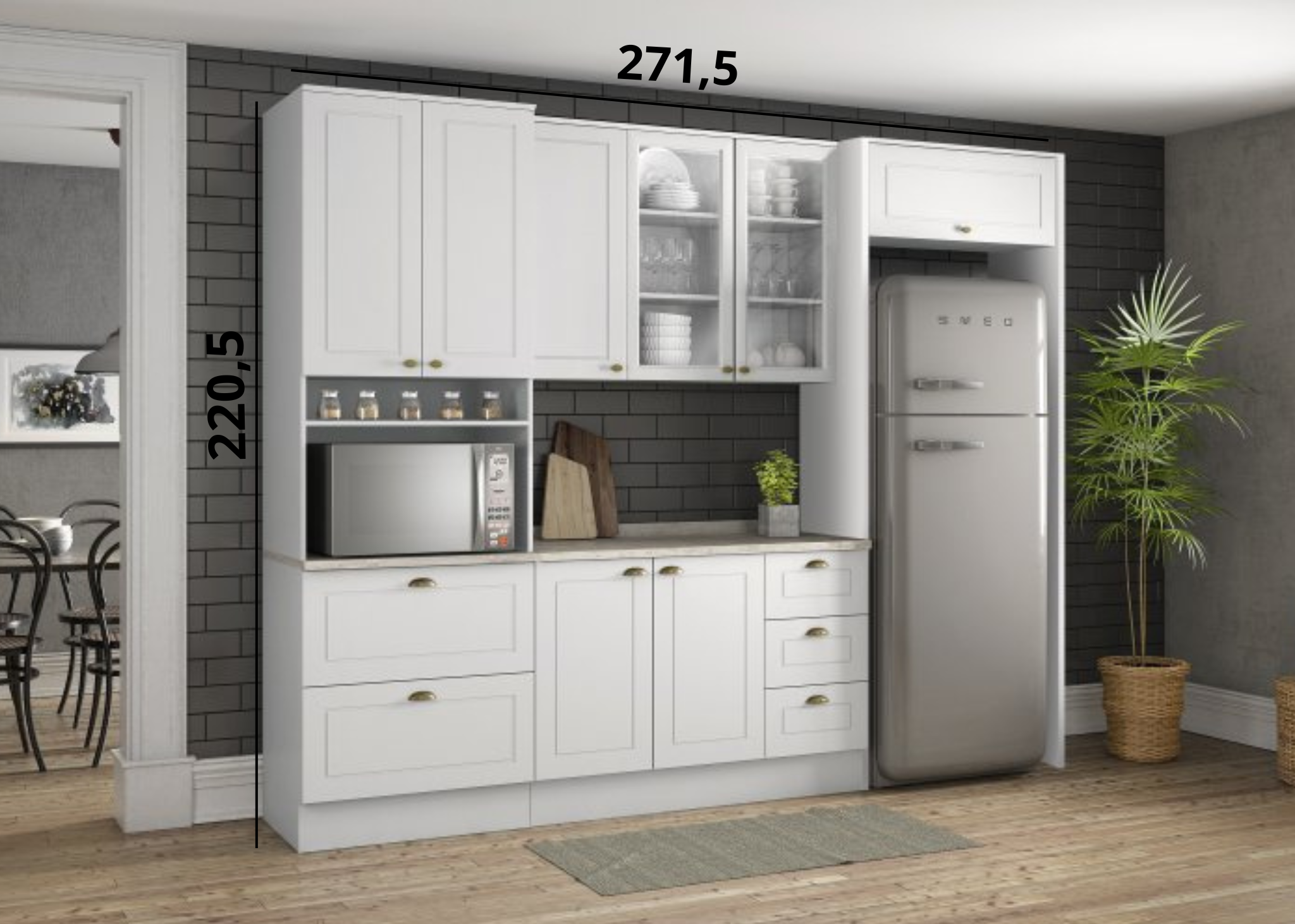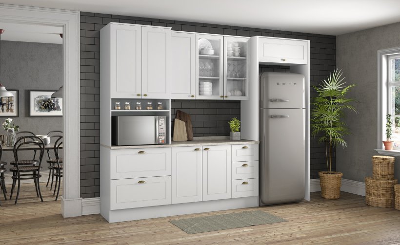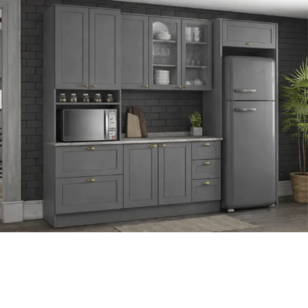 Cozinha completa aéreo com 5 portas de giro sendo 2 em vidro um aéreo com 1 porta basculante módulo com 2 gavetões um módulo com 2 portas de giro módulo com 3 gavetas 2 laterais para encaixe da geladeira.