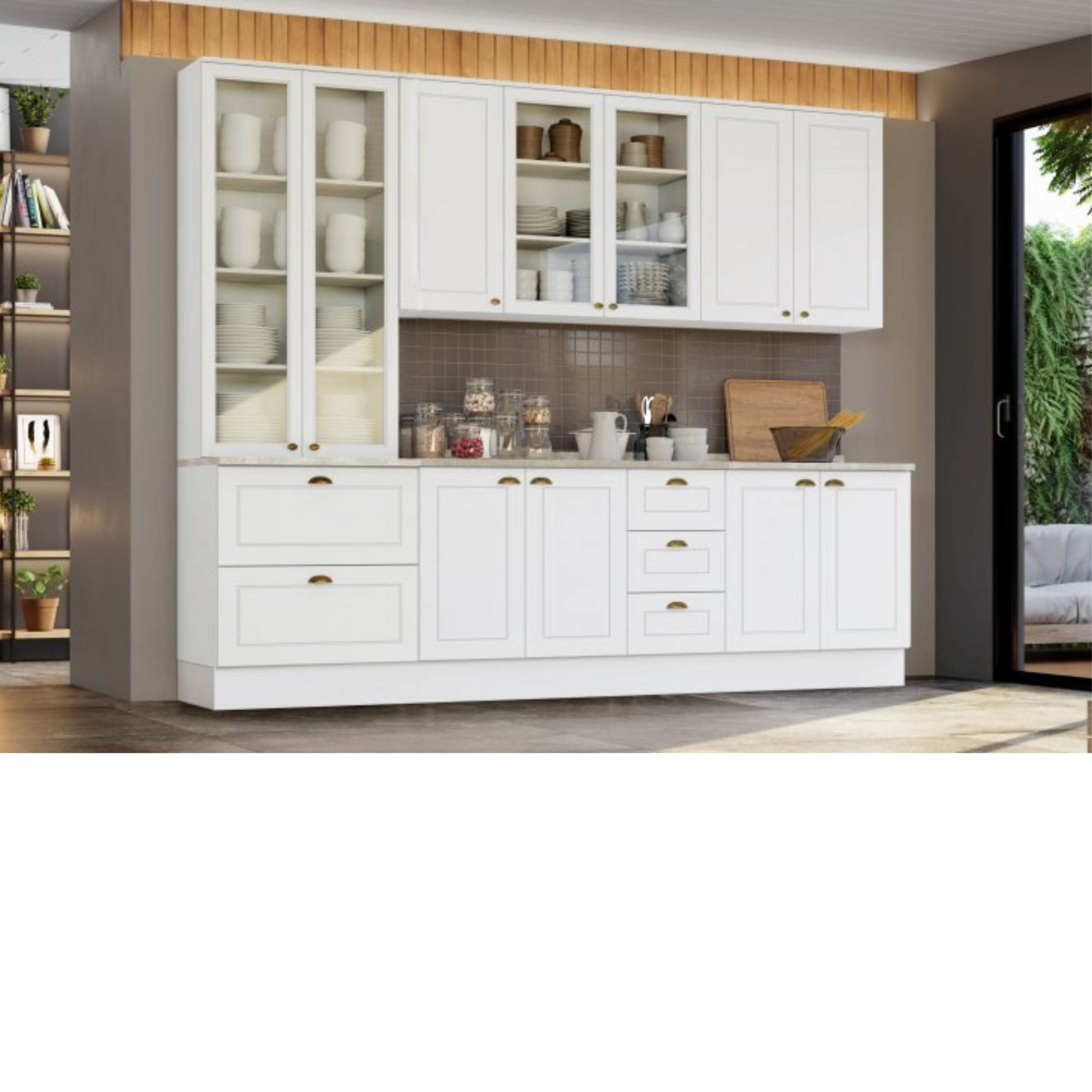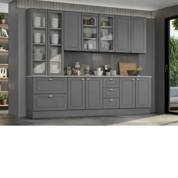 Cozinha completa com cristaleira com 2 portas de vidro aéreo com 2 portas de giro de vidro 2 aéreo com porta basculante nicho para microondas módulo inferior com 3 portas de giro 3 gavetas e 3 gavetões.