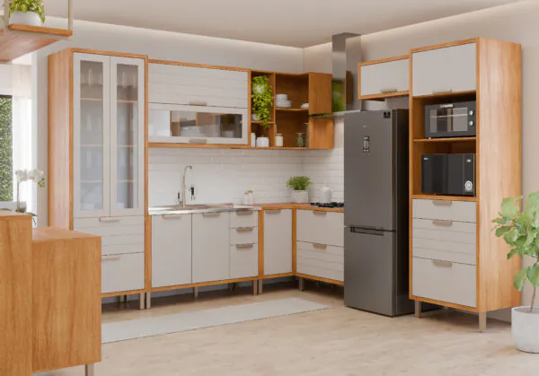 COZINHA MODULADA MG06-ELOISE COM 08 MÓDULOS RIPADO C/ CRISTALEIRA E TORRE QUENTE