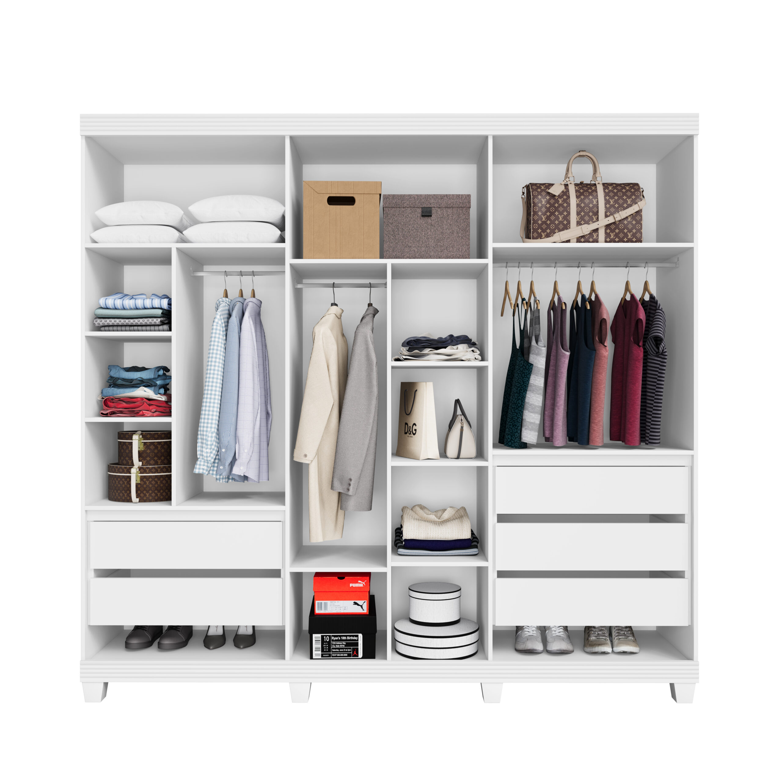 | Espaço amplo com 6 portas e 5 gavetas espaçosas, você terá muito espaço para organizar roupas, acessórios pessoais e conta com espelho central interno deslizante;