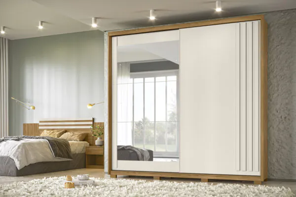 Roupeiro com espelho detalhes ripado buscando elegância e sofisticação ao seu quarto.
