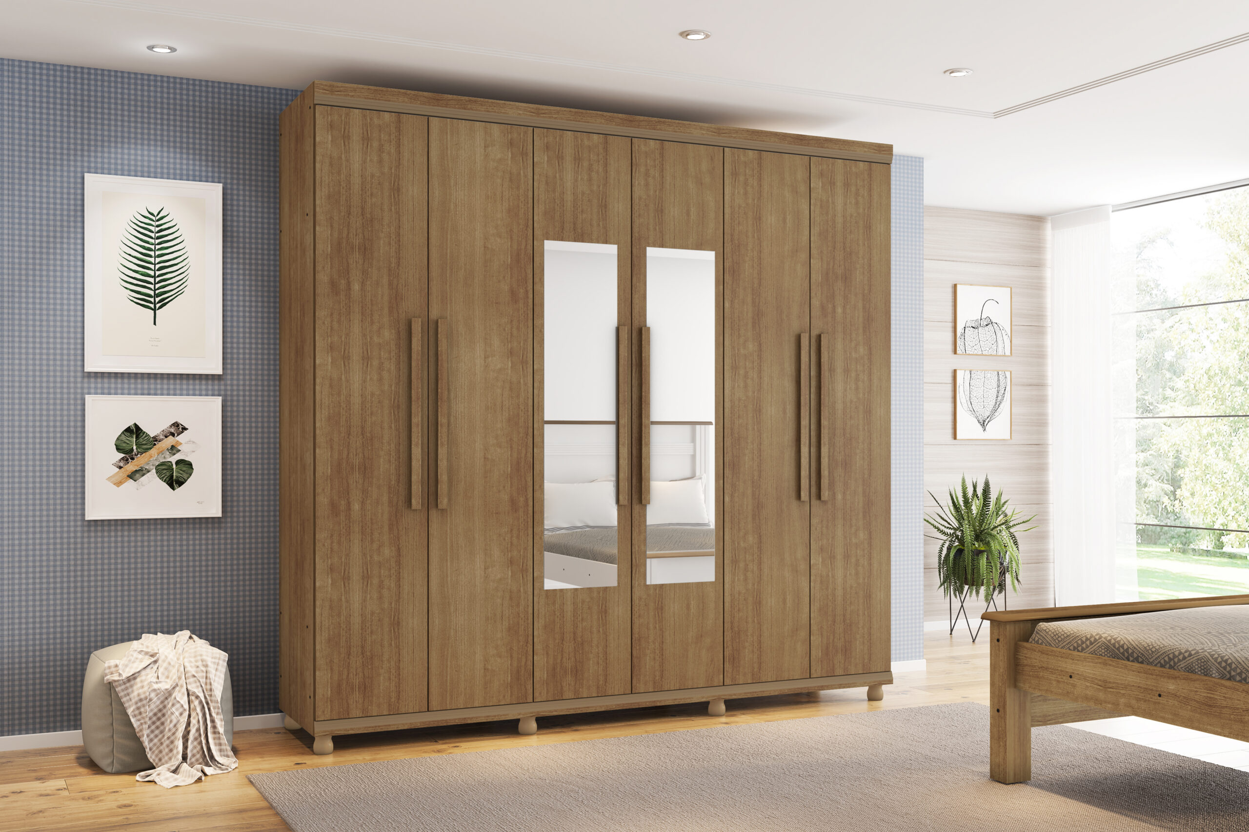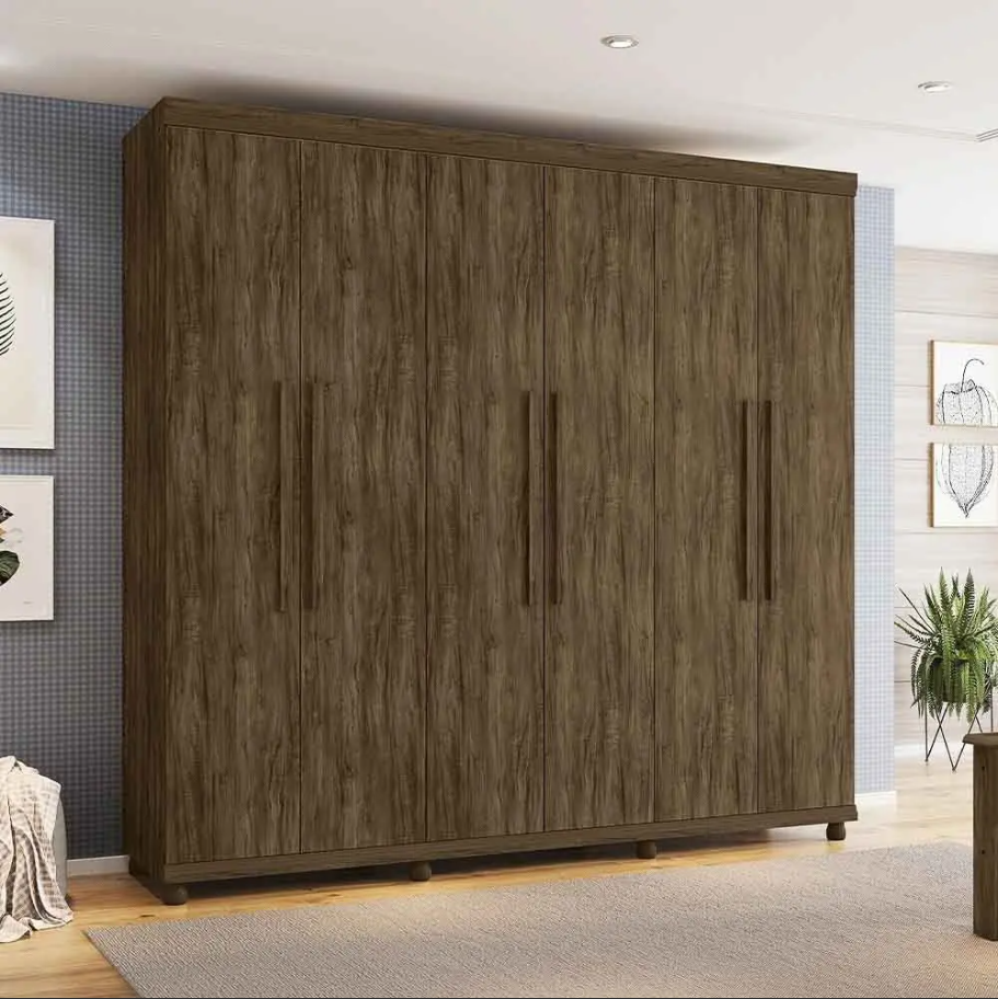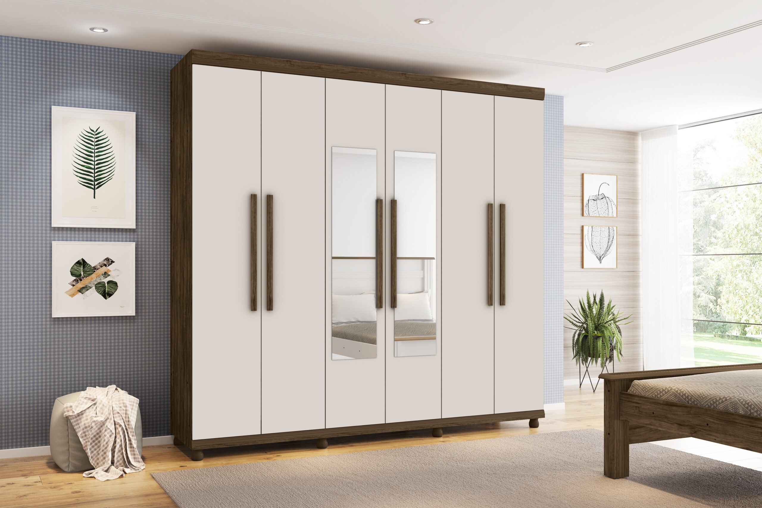 Acabamento: Em pintura uv Cor Predominante: Noce Bronze Cores Secundárias: Não possui Quantidade de Portas: 6 Tipo de Porta: De bater Quantidade de Gavetas: 3 gavetas internas Corrediça: Telescópica Cabideiro: Metálico Kit Espelho opcional. |