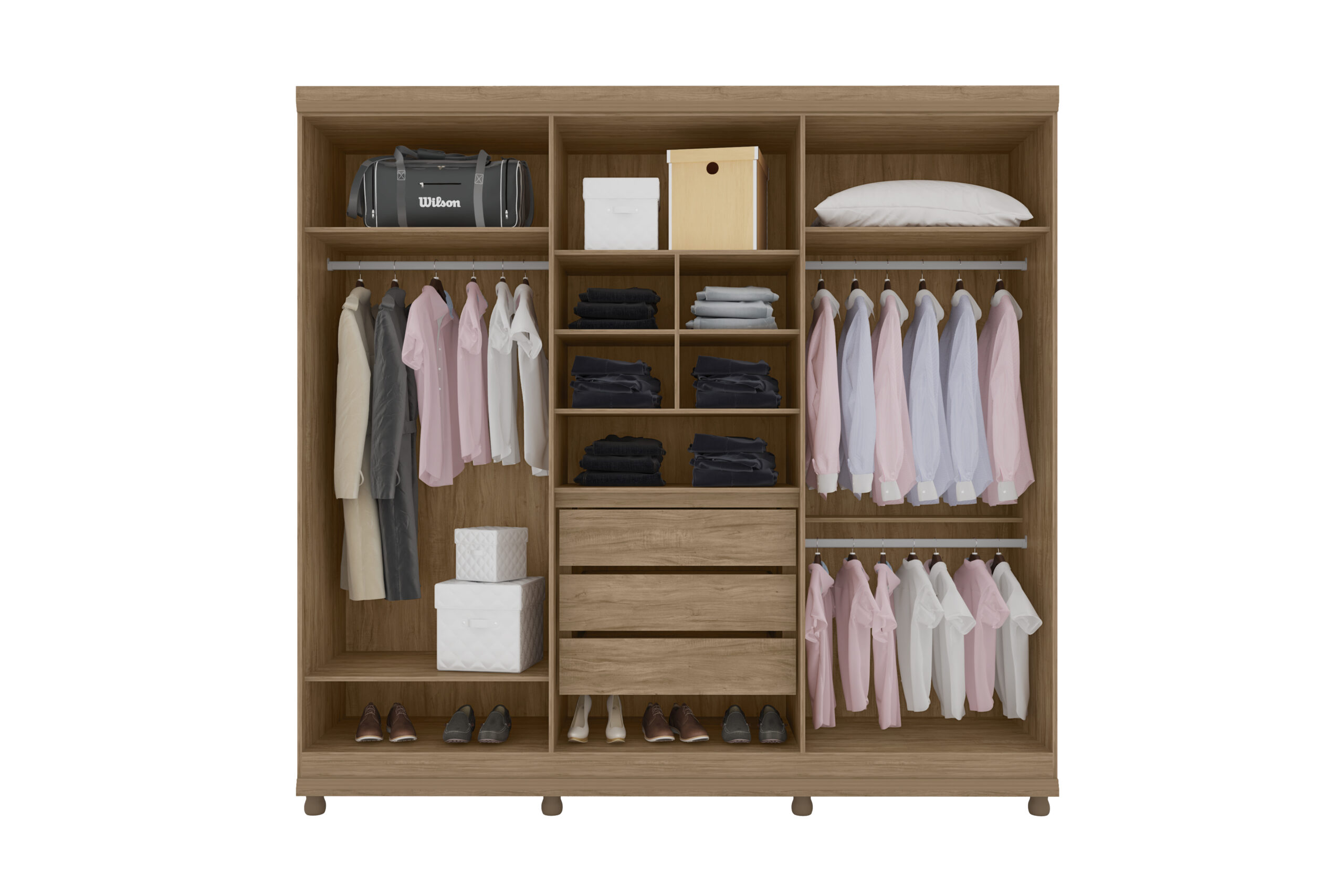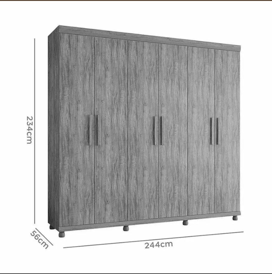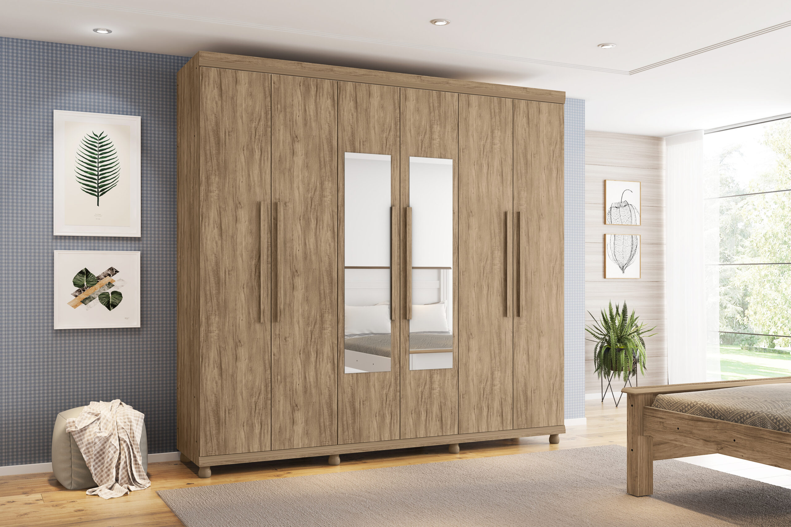 Acabamento: Em pintura uv Cor Predominante: Noce Bronze Cores Secundárias: Não possui Quantidade de Portas: 6 Tipo de Porta: De bater Quantidade de Gavetas: 3 gavetas internas Corrediça: Telescópica Cabideiro: Metálico Kit Espelho opcional. |