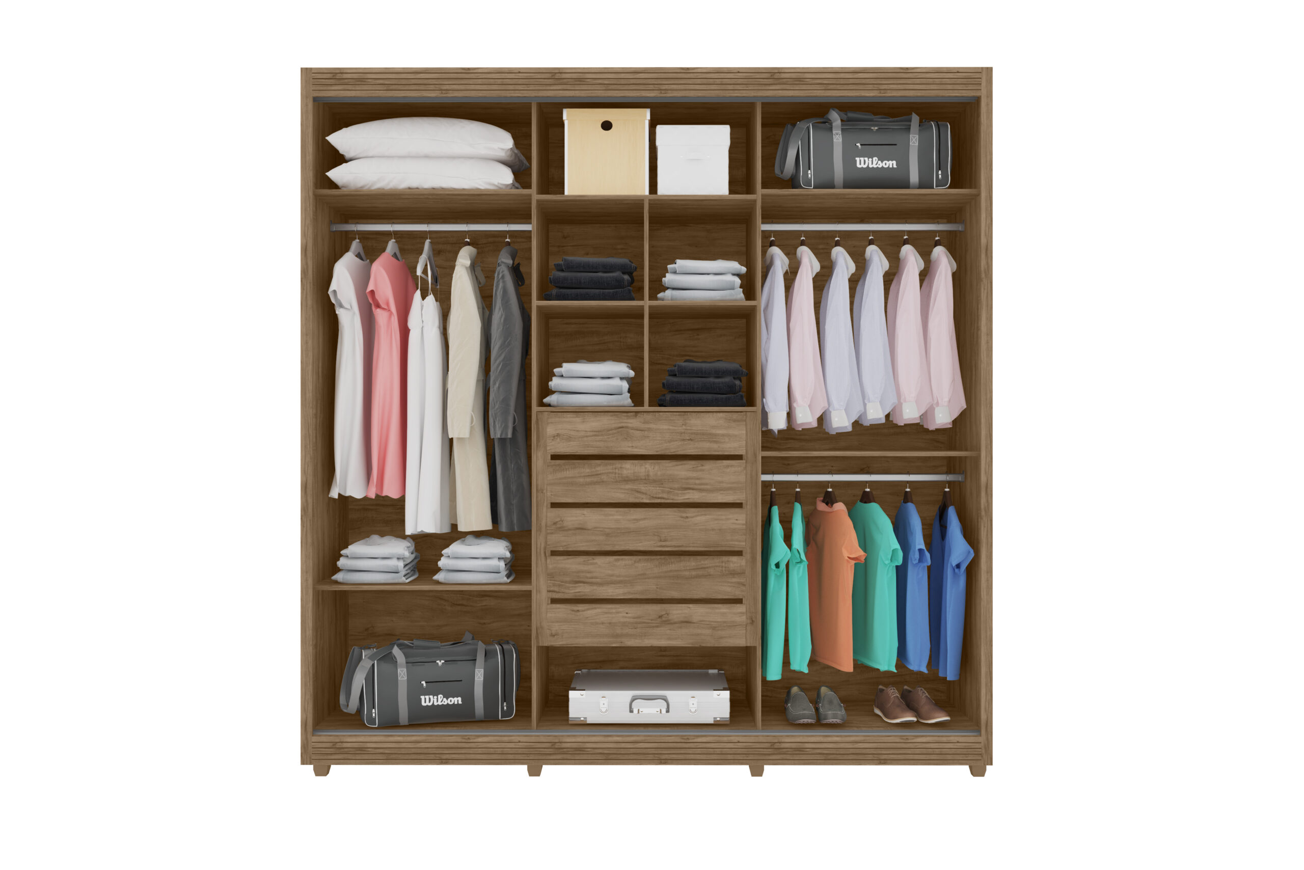 5 gavetas com corrediças telescópicas de deslizamento suave e silencioso Divisão interna Ele/Ela com espaço maleiro e prateleiras de 15mm Cabideiros especiais para calças e vestidos sem amassar Estrutura 100% MDF com pés que aumentam a durabilidade. |