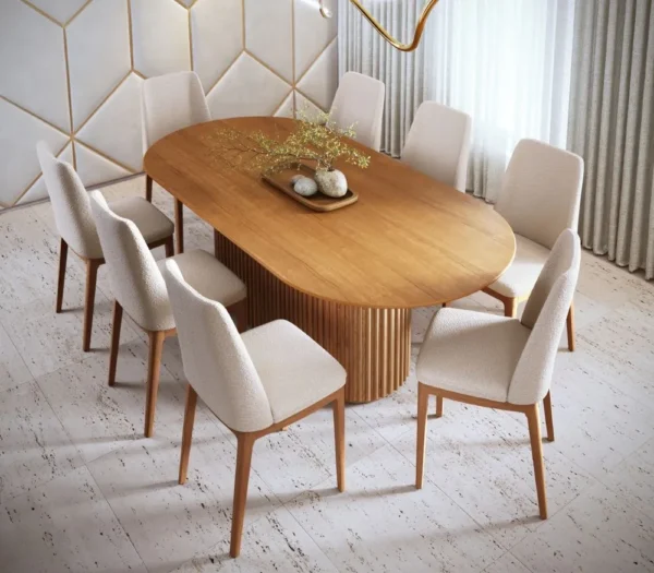 Mesa Living 1.6 Oval: Com base revestida em lâmina de madeira cinamomo e ripas em madeira maciça, essa mesa oval combina estilo e robustez. O tampo em MDF de 25mm, com bordas laqueadas e chanfradas a 30º, está disponível em duas opções: vidro de 3mm pintado Off White ou revestido em lâmina de madeira cinamomo. Possui base inferior para fixação do tampo e sapatas reguláveis niveladoras, oferecendo estabilidade e elegância para qualquer ambiente.