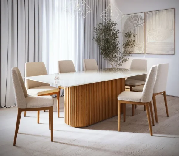 Mesa Living 1.8 Retangular: Com base revestida em lâmina de madeira cinamomo e ripas em madeira maciça, essa mesa combina durabilidade e sofisticação. O tampo em MDF de 25mm, com bordas laqueadas e chanfradas a 30º, está disponível em duas opções: vidro de 3mm pintado em Off White ou revestido em lâmina de madeira cinamomo. A mesa possui base inferior para fixação do tampo e sapatas reguláveis niveladoras, garantindo estabilidade e adaptabilidade ao seu ambiente.