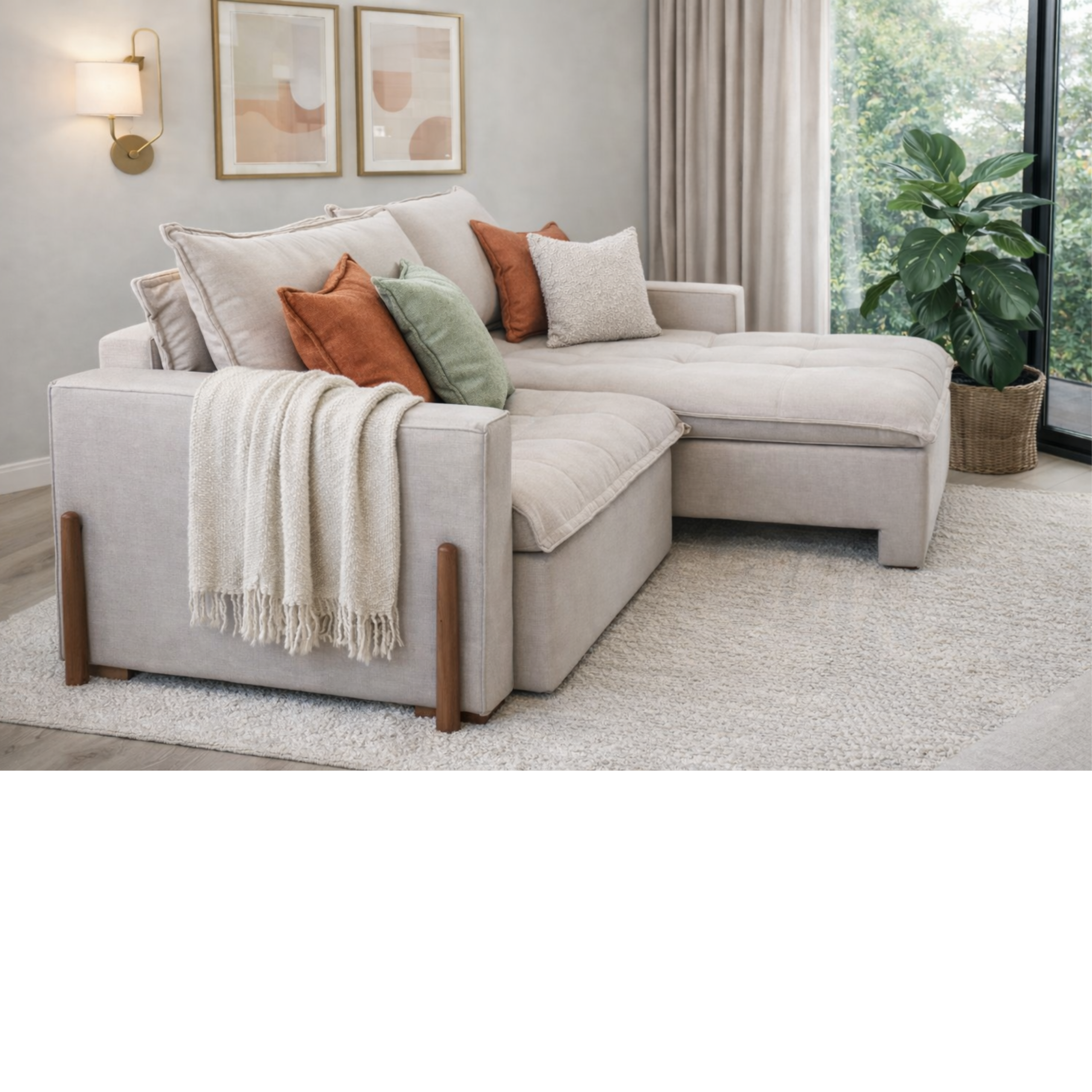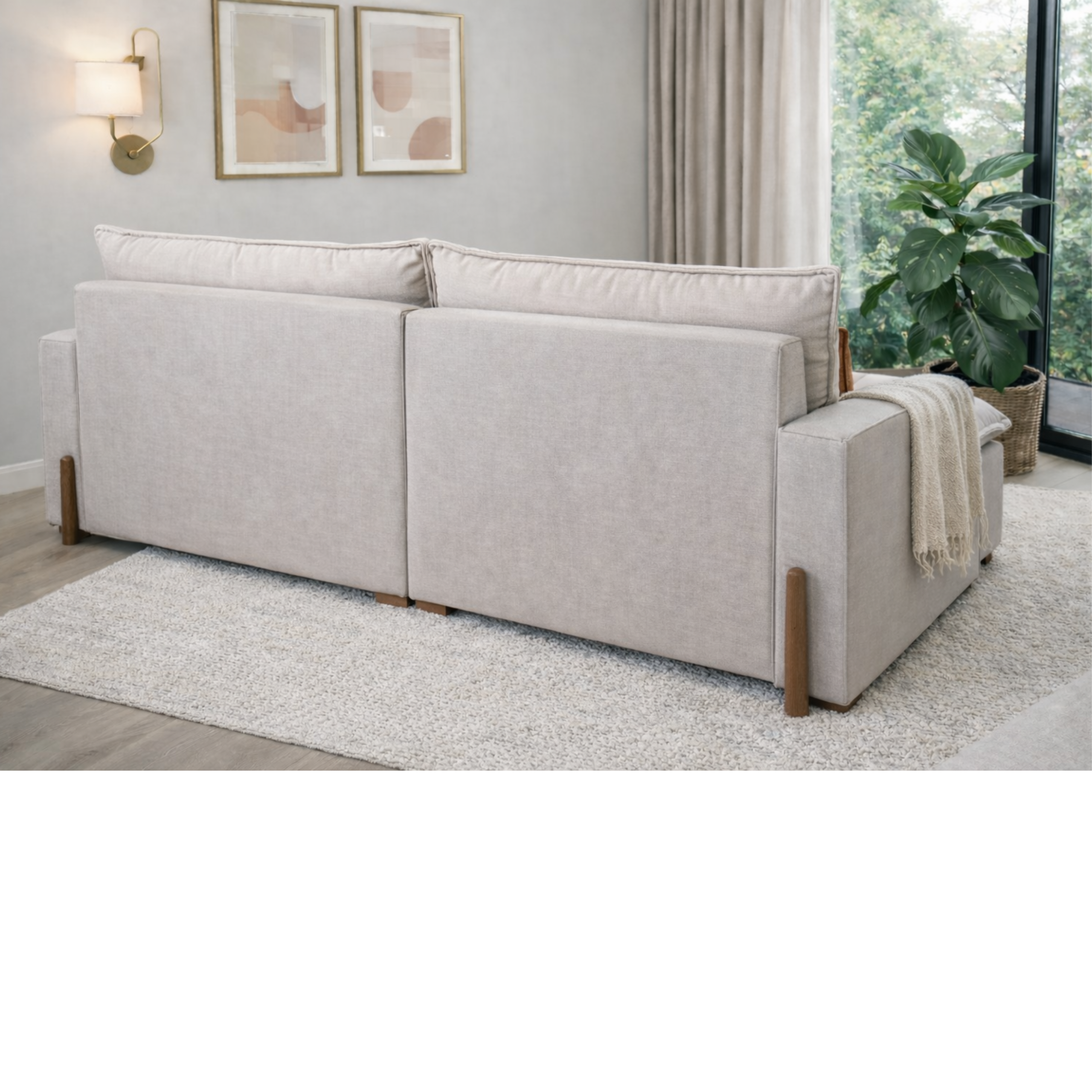 Sofá Marsala retrátil zero caixa estofado com molas ensacadas lateral com detalhe em madeira.